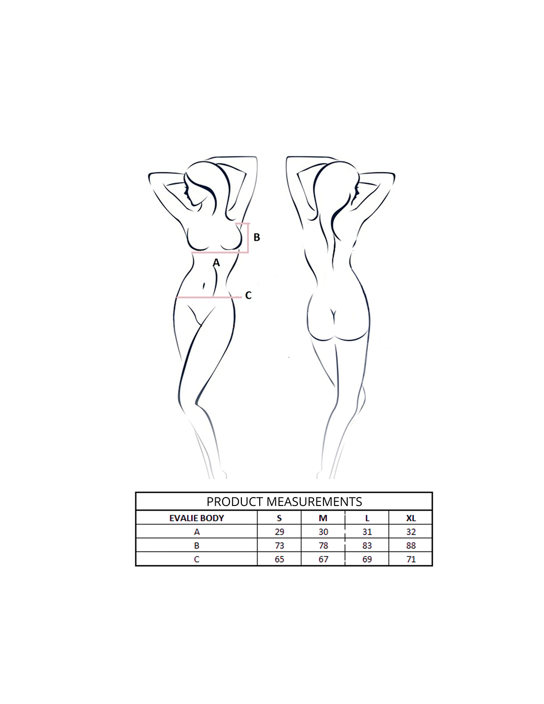 El Body EVALIE encarna la esencia de la elegancia y la sensualidad femenina. Confeccionado con una refinada combinación de delicado encaje y tejido suave y elástico, logra el equilibrio perfecto entre sofisticación y minimalismo moderno. El profundo escote en V, adornado con un intrincado encaje, realza el busto con belleza, aportando ligereza a la silueta. Las transparencias en la parte delantera aportan un toque atrevido, mientras que la suave parte inferior garantiza un ajuste y una comodidad impecables.