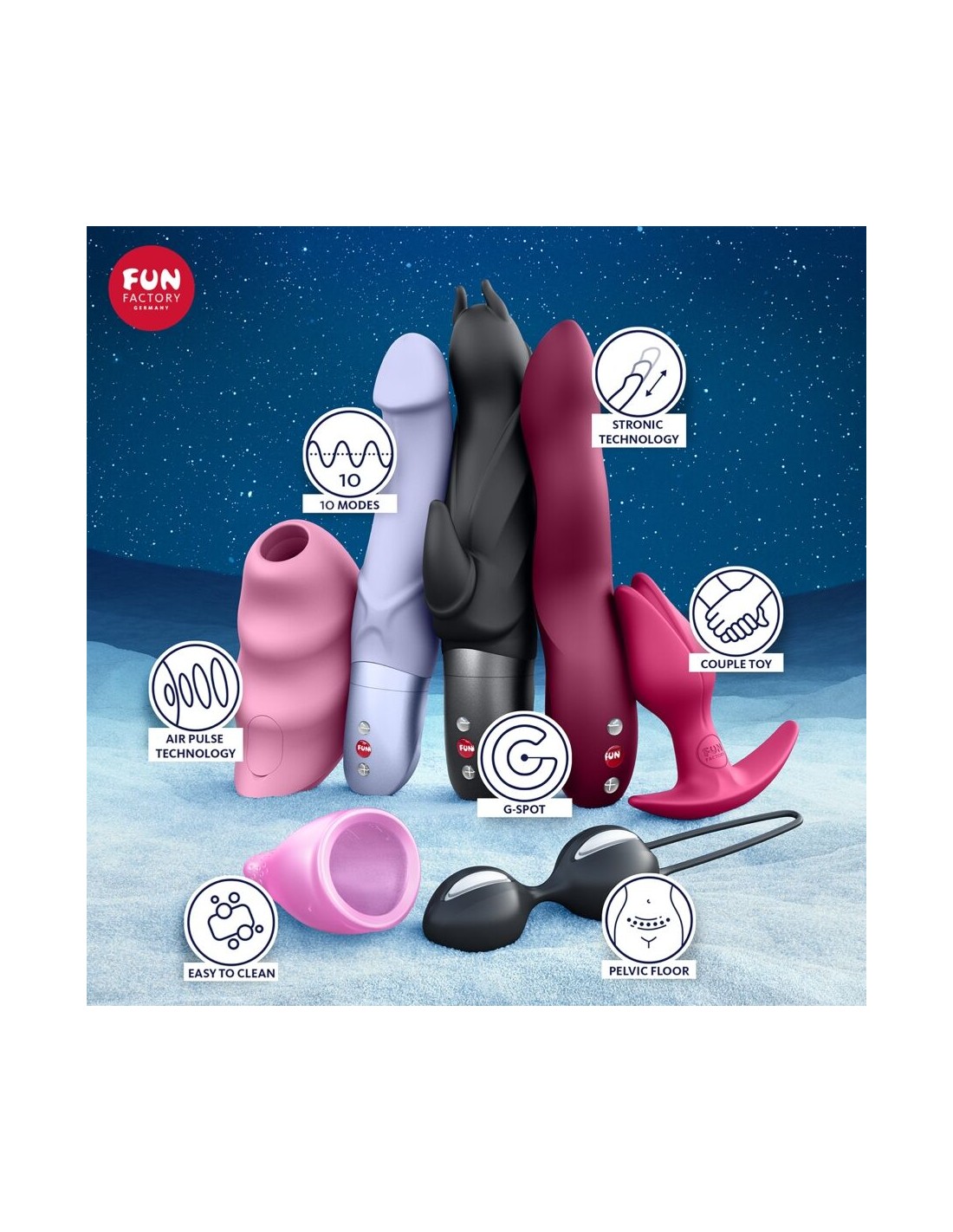 Suave como un copo de nieve: El Intense se apoya suavemente sobre el clítoris y lo deleita con ondas de aire sin contacto en 11 niveles de intensidad, de suave a potente. ¿Buscas algo más que vibraciones clásicas? Experimenta sensaciones realmente auténticas con Mr. Boss y Stronic Wave, con su innovadora tecnología de empuje. Mientras que Mr. Boss impresiona por su forma realista y su punta ergonómica para una estimulación precisa del punto G, Stronic Wave ofrece siete modos y tres velocidades para momentos de placer infinitos.