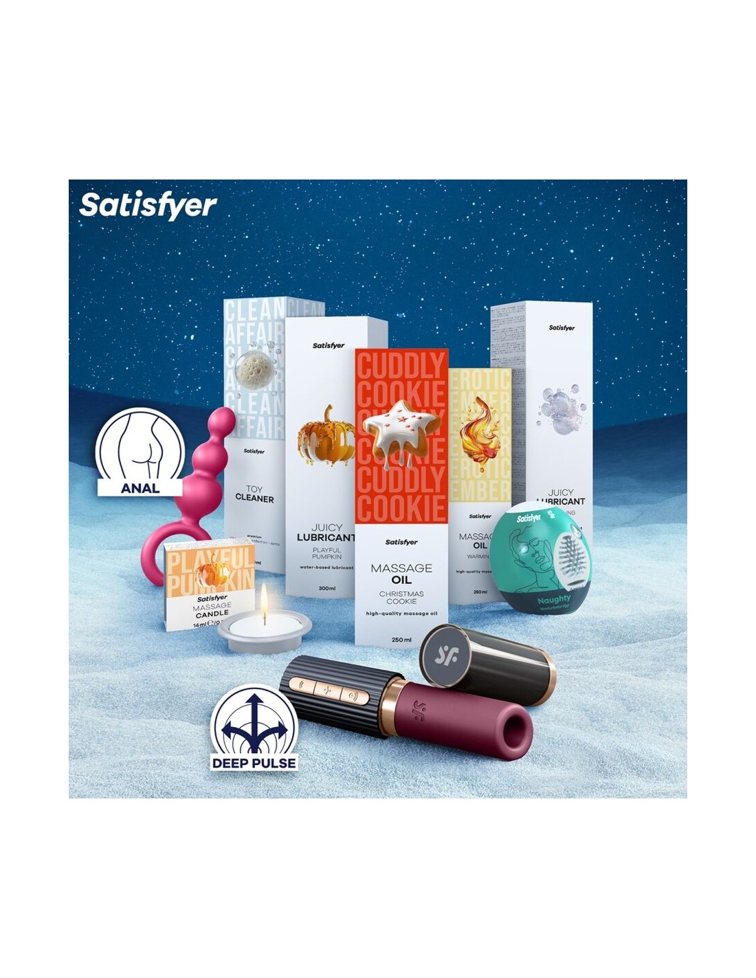 El Aceite de Masaje Calor para masajes eróticos, el Lubricante de Galleta Navideña para una experiencia sedosa y la vela aromática Calabaza Juguetona para crear el ambiente perfecto para un romance inolvidable: en nuestro Spa de Indulgencia, encontrarás todo tipo de productos de bienestar Satisfyer diseñados para subir la temperatura incluso en las noches más frías de Navidad. Sin olvidar el Lubricante de Agua con Gas a base de agua de Satisfyer, que infunde un efecto chispeante y estimulante en tus encuentros más apasionados. Y como una sola vez no es suficiente, el calendario también incluye el Limpiador de Juguetes Satisfyer, diseñado para preparar tus juguetes sexuales para su próxima aventura en un instante. Con solo una pulverización, elimina las bacterias de forma fiable y proporciona frescura.