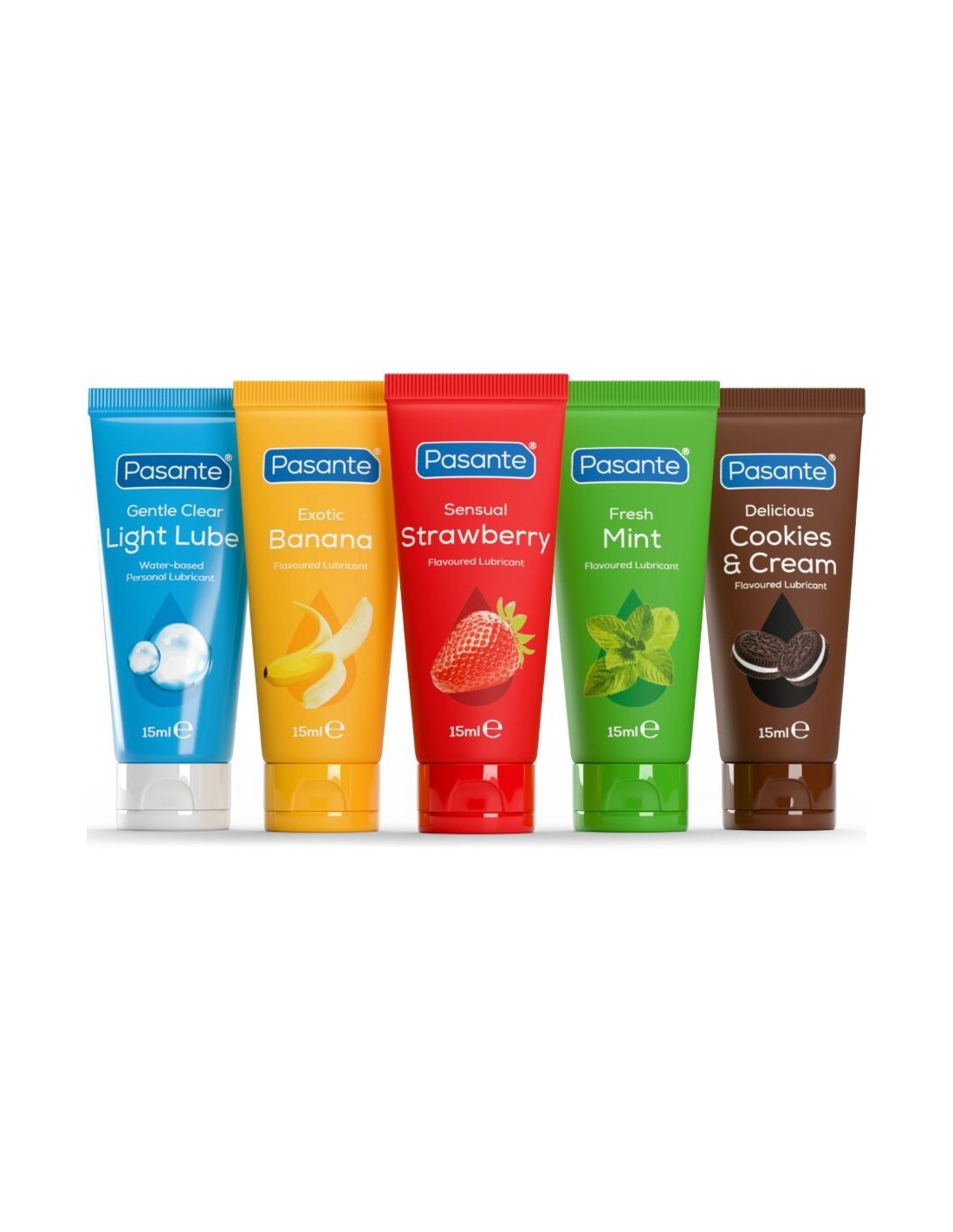 Explore new sensations, enjoy delicious flavors, and create unforgettable moments with your partner. Trust Pasante to provide you with the highest quality lubricants that are safe, reliable, and enjoyable. Inside the fun pack you'll find a variety of 15ml personal lubricant tubes including: