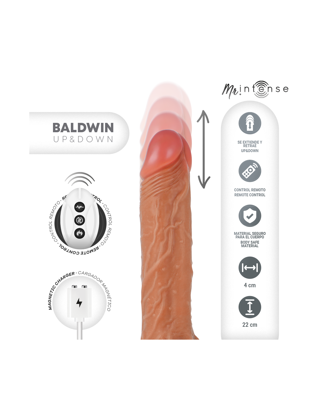 Laissez-vous emporter par une expérience intense et réaliste avec BALDWIN , le godemichet star de la collection MR INTENSE. Conçu pour les amateurs de plaisir puissant et profond, ce vibromasseur réaliste allie une esthétique hyperréaliste à une mécanique interne simulant le mouvement naturel des poussées verticales (Up & Down) pour des sensations totalement immersives. Avec une tige flexible de 22 cm de longueur totale, dont 15 cm insérables, et un diamètre moyen de 4 cm, BALDWIN offre une présence solide et satisfaisante sans compromettre le confort. Son corps est recouvert de silicone ultra-doux, de haute qualité et sans danger pour le corps, au toucher soyeux qui imite la peau.